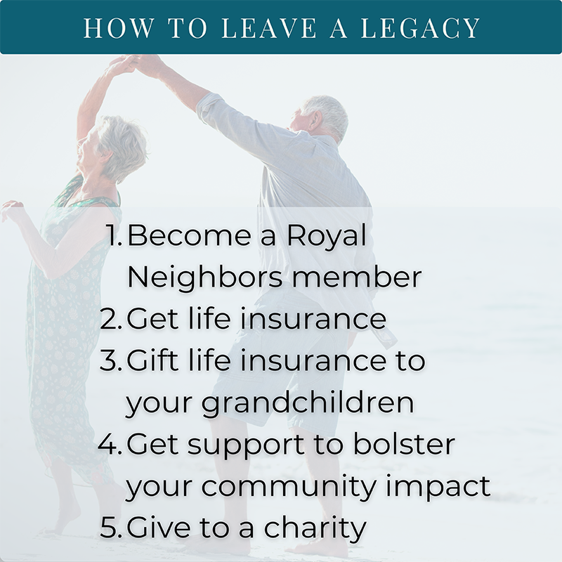 Royal Neighbors of America® (NAIC #57657), is an Illinois corporation and is licensed in all states and the District of Columbia, except AL, AK, HI, LA, MA, NH, NY. Not all products are available in all states. Contractual provisions and limitations may vary by state.