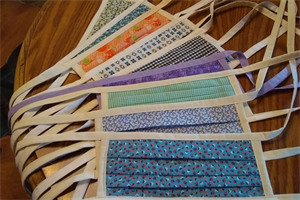 Sew close to the open edge of the binding, sandwiching the mask inside, folding under the binding edges and catch in the same seam, then backstitch. Complete at the top and bottom of the mask. Create three pleats each about ½”, all facing downward. Pin and stitch well.